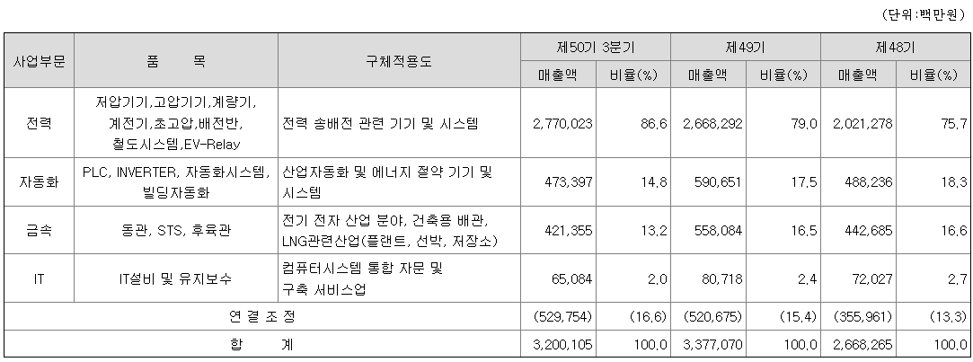 전력사업은 발전소에서 만들어진 전력에 대해 수용가까지 전력공급과 계통보호에 전반적으로 사용되는 제품을 생산하는 전력기기/시스템사업과 전력공급계통에 존재하는 각종 전력정보 관리 및 제어를 통해 발전설비 운용/에너지사용 효율화 및 급전 안정화를 구현하는 전력IT사업, 태양광 발전시스템을 위한 EPC 사업과 ESS 관련 시스템 구축 EPC 사업 등 신재생 에너지 사업, 철도분야의 전력 및 신호제어 시스템 구축을 위한 철도 시스템 EPC사업을 영위하고 있습니다. 주요재화 및 용역으로는 전력기기, 고압기기, 계량기, 계전기, 초고압, 배전반, 철도시스템, 신재생 에너지, EV-Relay가 있으며 주요 고객으로는 한국전력, 특약점, 에너지 다소비 기업 등이 있습니다. 당분기 매출액은 2,770,023백만원으로 전체의 86.6%를 차지하고 있습니다.