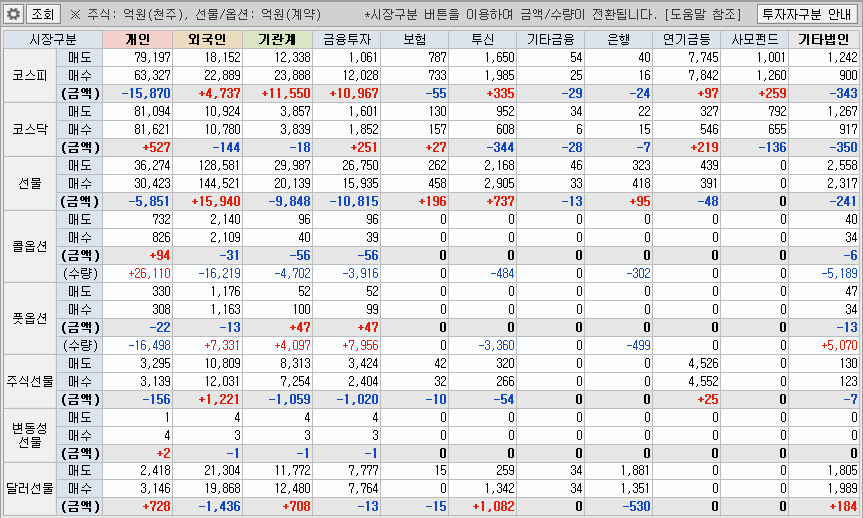 금일은 개인이 1조 5천억을 팔고 기관이 1조1천억 외국인이 4천억원을 매수 하였습니다