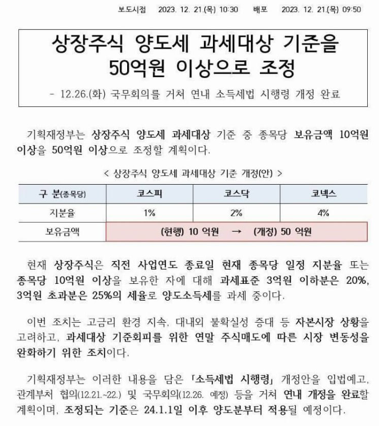 주식 양도세 50억으로 인상!!!