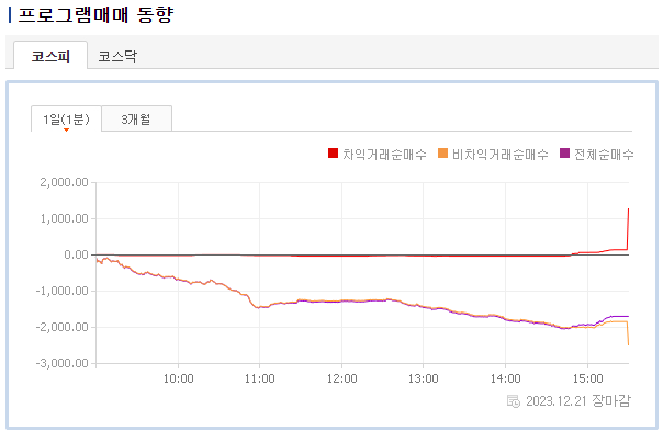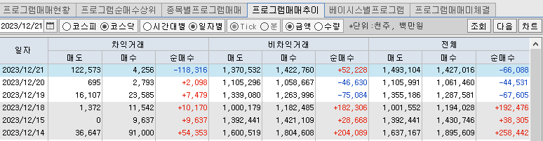 프로그램 매매 동향은 차익은 순매도로 마감하였고 비차익은 순매수로 마감하였습니다
