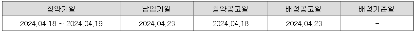 - 일반청약자 청약일: 2024년 4월 18일 ~ 4월 19일 (2일간)