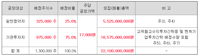 「증권 인수업무 등에 관한 규정」 제9조제11항에 의거하여 일반청약자에게 배정하는 전체수량(동 규정 제9조제1항제6호에 따른 배정수량을 포함한다)의 50% 이상을 최소 청약증거금 이상을 납입한 모든 일반청약자에게 동등한 배정기회를 부여하는 방식(이하 "균등방식 배정"이라 한다)으로 배정하여야하며 나머지를 청약수량에 비례하여 배정(이하 "비례방식 배정"이라 한다)합니다. 따라서 금번 일반청약자 균등방식 예정물량은 162,500주 이상입니다.