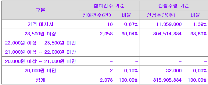 대표주관회사인 아이비케이투자증권㈜은 상기와 같이 제시된 희망공모가액을 바탕으로 국내외 기관투자자를 대상으로 수요예측을 실시하였으며, 동 수요예측 결과 및 주식시장 상황 등을 고려하여 발행회사인 ㈜한중엔시에스와 대표주관회사가 합의하여 확정공모가액을 최종 결정하였습니다.