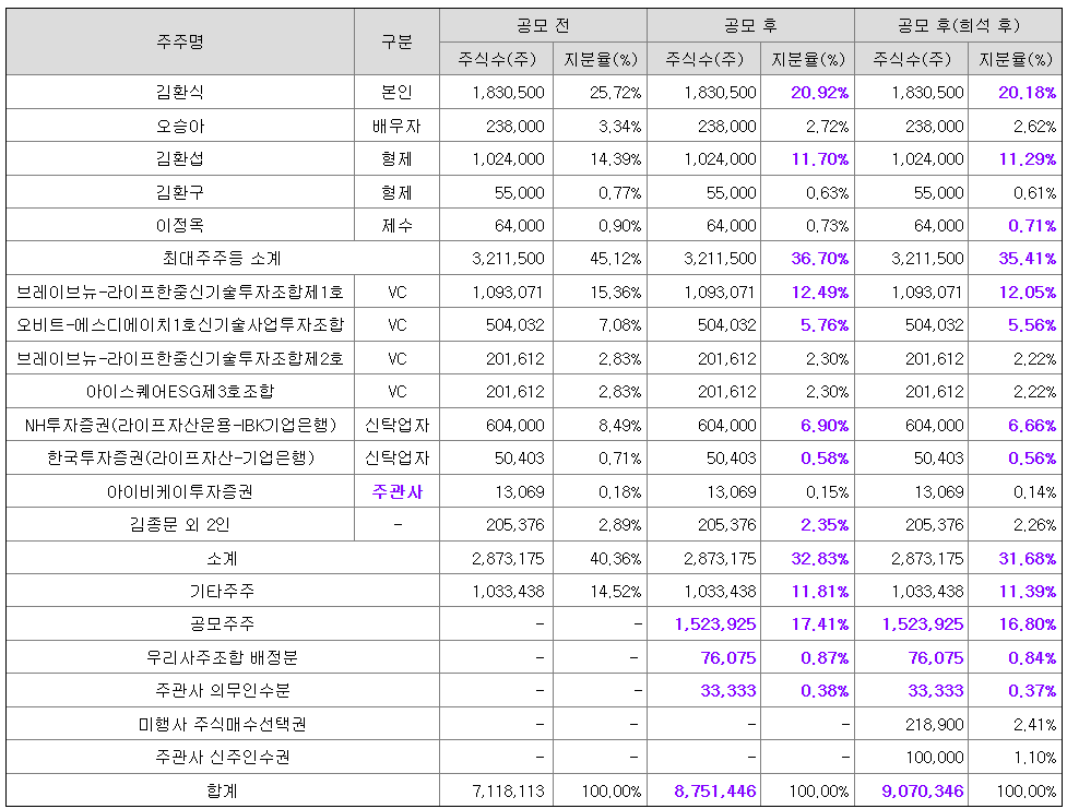 당사의 상장예정주식수 8,766,113주 중 최대주주 김환식 대표이사가 보유한 1,830,000주(공모 후 지분율 20.88%) 및 특수관계인 4인이 보유한 3,211,500주(공모 후 지분율 36.70%)는 「코스닥시장 상장규정」 제26조 제1항 제1호에 의거하여 상장일로부터 1년 간 의무보유하게 됩니다.