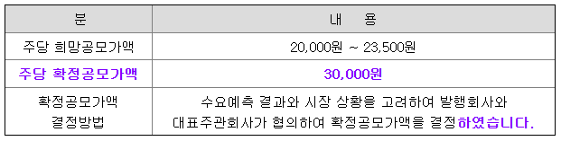 주당 공모가액 및 모집(매출)총액은 대표주관회사인 아이비케이투자증권㈜와 발행회사인 ㈜한중엔시에스가 협의하여 결정한 확정공모가액인 30,000원 기준입니다.