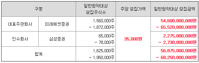 금번 모집에서 일반청약자에게 배정된 모집물량은 대표주관회사인 미래에셋증권㈜, 인수회사인 삼성증권㈜를 통하여 청약이 실시됩니다