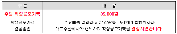 금번 산일전기㈜의 유가증권시장 상장 공모를 위한 확정공모가액은 향후 수요예측 결과 및 주식시장 상황 등을 감안하여 대표주관회사 및 발행회사가 협의하여 35,000원으로 결정하였습니다.