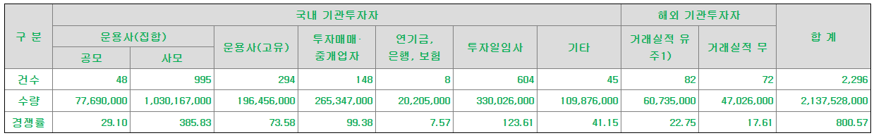 경쟁률은 기관투자자 배정주수 2,670,000주를 기준으로 산출한 단순경쟁률입니다.