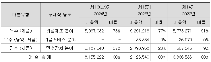우주산업은 위성제조, 지상장비, 위성서비스, 발사체 분야로 나누어지며 당사는 위성제조 분야와 위성 서비스 분야에서 핵심 기술 및 다양한 제품을 보유하고 있습니다.