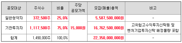 주당 공모가액 및 모집(매출)총액은 대표주관회사와 발행회사가 협의하여 결정한 확정공모가액 15,000원 기준입니다