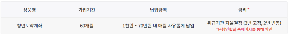 청년의 중장기 자산형성 지원을 위한 정책형 금융상품으로, 만기 5년(60개월) 동안 매월 70만원 한도 내에서 자유롭게 납입하면 매월 최대 6%의 정부기여금을 지급하고 이자소득에 대한 비과세 혜택을 제공하는 상품