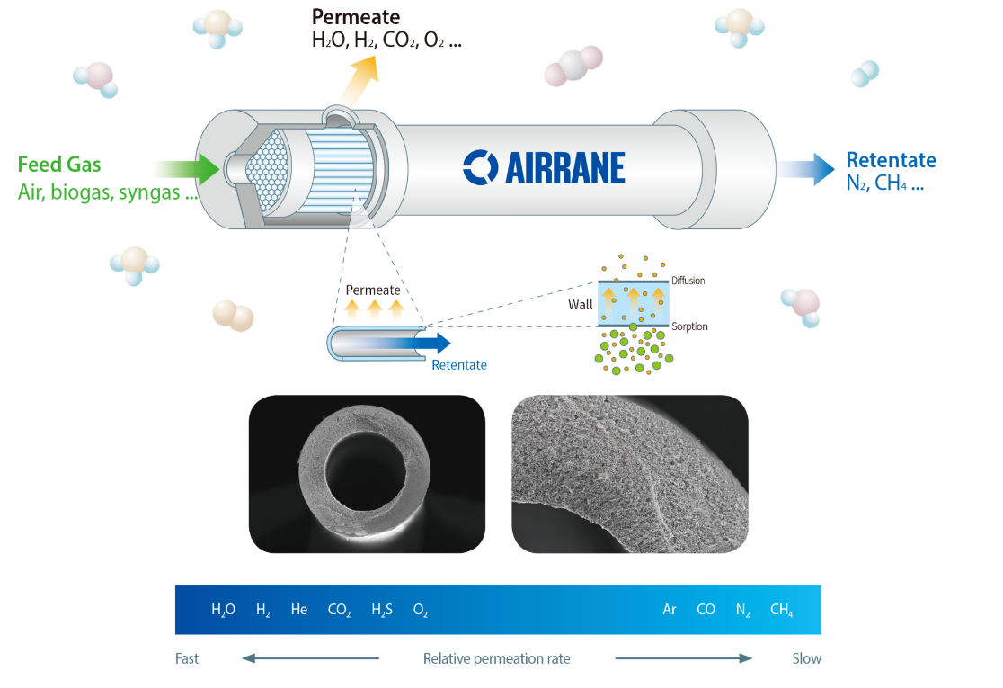 예를 들면, 압축공기로부터 투과도가 높은 산소를 투과기체(Permeate)로, 투과도가 낮은 질소를 잔류기체(Retentate)로 분리하며, 바이오가스 정제시에는 상대적으로 투과성능이 높은 이산화탄소가 분리막을 통과하여 투과기체가 되고, 메탄은 잔류기체로 분리됩니다.