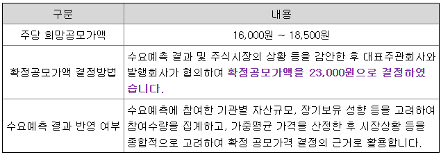 주당공모가액 및 모집(매출)총액은 확정공모가액인 23,000원 기준입니다.