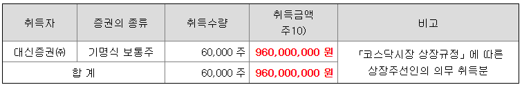 - 취득금액은 「코스닥시장 상장규정」상 모집·매출하는 가격과 동일한 가격으로 취득하여야 하며 상기 취득금액은 대표주관회사와 발행회사가 협의하여 결정한 16,000원 기준입니다.