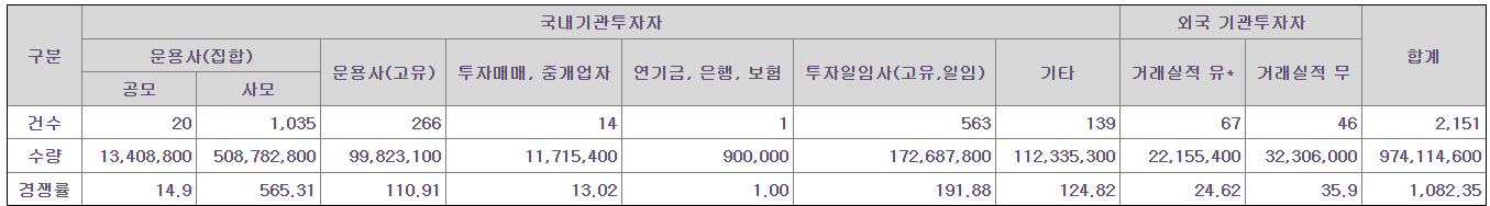 대표주관회사인 미래에셋증권㈜는 상기 희망공모가액을 바탕으로 국내외 기관투자자를 대상으로 수요예측을 실시하였으며, 확정공모가액은 동 수요예측 결과 및 주식시장 상황 등을 고려하여 대표주관회사 및 발행회사가 협의하여 13,000원으로 결정하였습니다.