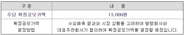 대표주관회사인 미래에셋증권㈜는 상기 희망공모가액을 바탕으로 국내외 기관투자자를 대상으로 수요예측을 실시하였으며, 확정공모가액은 동 수요예측 결과 및 주식시장 상황 등을 고려하여 대표주관회사 및 발행회사가 협의하여 13,000원으로 결정하였습니다.