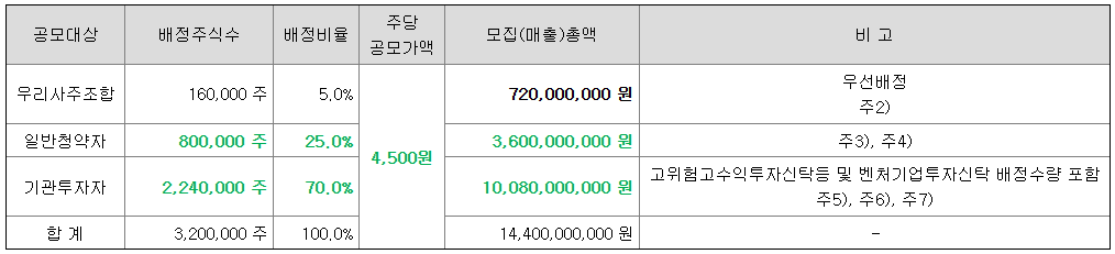 ① 우리사주조합 : 공모주식의 5.0%(160,000주)를 배정합니다.
