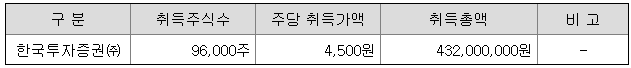 주당 취득가액 및 취득총액은 대표주관회사와 발행회사가 협의하여 제시한 희망공모가액인 4,500원 ~ 6,500원 중 최저가액인 4,500원 기준입니다.