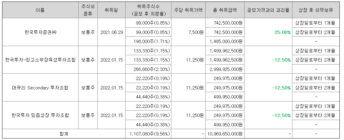공모가격과의 괴리율은 (공모가격-취득가액)/공모가격이며, 공모가격은 확정공모가액 10,000원 기준으로 산출하였습니다.