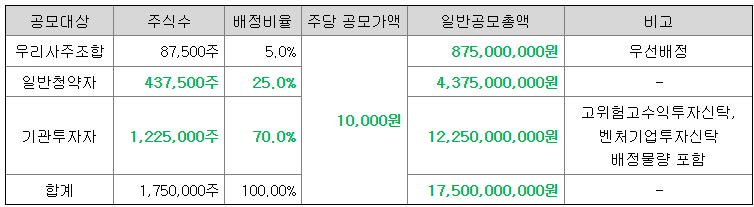① 우리사주조합 : 공모주식의 5.0%(87,500주)를 배정합니다.