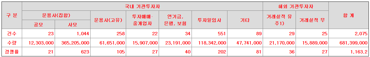 수요예측 참여 건수 및 수량은 수요예측 이전 기관투자자 배정물량인 585,800주~757,500주의 상단인 757,500주를 기준으로 주문을 받은 결과이며, 경쟁률은 1,585,800주를 기준으로 산출된 결과입니다.