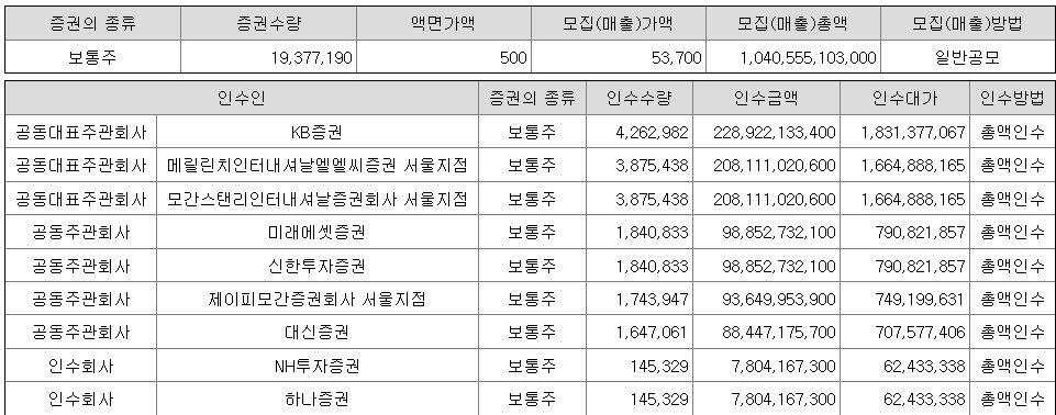 모집(매출)가액, 모집(매출)총액, 인수금액 및 인수대가는 공동대표주관회사, 공동주관회사와 발행회사 및 매출주주가 합의하여 결정한 확정공모가액인 61,900원 기준입니다.