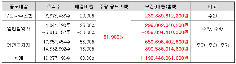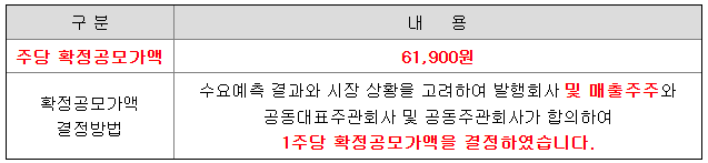 모집(매출)가액, 모집(매출)총액, 인수금액 및 인수대가는 공동대표주관회사, 공동주관회사와 발행회사 및 매출주주가 합의하여 결정한 확정공모가액인 61,900원 기준입니다.