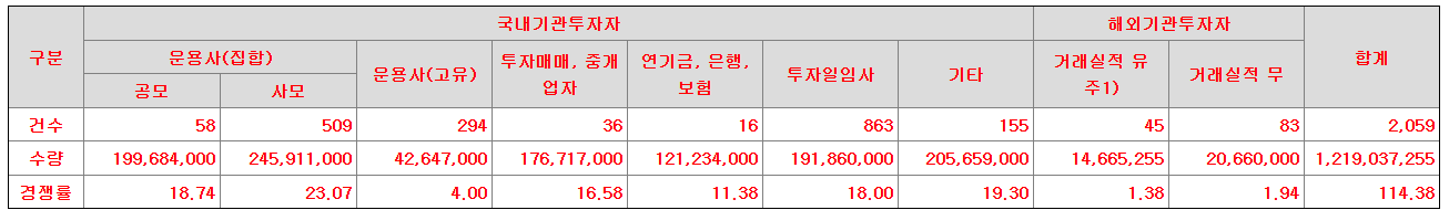 수요예측 참여 건수 및 수량은 수요예측 전 기관투자자 잠재 배정물량인 55%~75%의 상단인 75%(14,532,892주) 기준으로 주문을 받은 결과이며, 경쟁률은 수요예측 이후 하단 55%(10,657,454주) 기준으로 산출한 결과입니다.