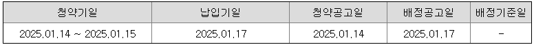 - 일반청약자 청약일: 2025년 01월 14일(화) ~ 2025년 01월 15일(수) (2일간)