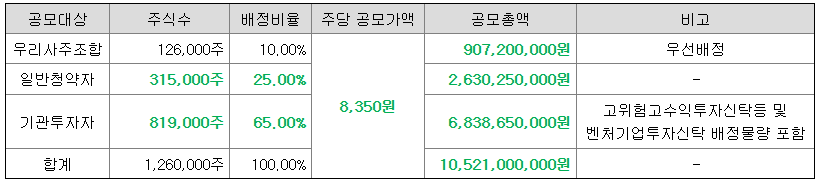 ② 기관투자자 : 총 공모주식의 65.00% (819,000주)를 배정합니다. (기관투자자에는 고위험고수익투자신탁등 및 벤처기업투자신탁을 포함)