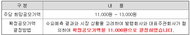 주당 공모가액 및 모집(매출)총액은 대표주관회사와 발행사가 협의하여 결정한 확정공모가액인 11,000원 기준입니다.