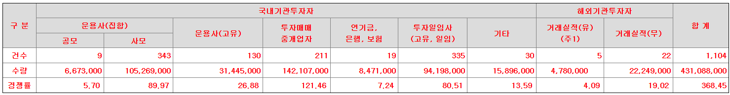 ① 기관투자자(고위험고수익투자신탁등, 벤처기업투자신탁 포함) : 전체 공모주식의