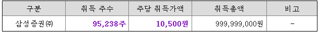 동 상장주선인 의무취득분은 「코스닥시장 상장규정」에 의거하여, 공모주식수량의 100분의 3을 사모의 방식으로 취득하게 되며, 동 취득금액이 10억원을 초과할 경우 10억원을 한도로 취득하게 됩니다. 따라서, 공모확정가액이 10,500원으로 결정됩에 따라 그 취득수량이 95,238주로 결정되었습니다.