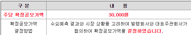수요예측 결과 및 주식시장 상황 등을 감안하여 대표주관회사와 발행회사가 협의하여 30,000원으로 결정하였습니다.
