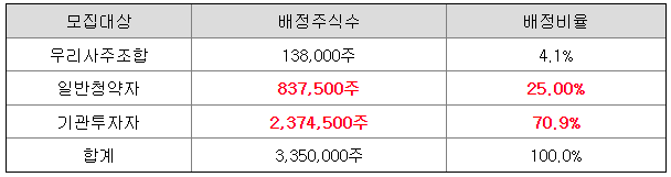 IPO는 일반청약자에게 3,350,000주에서 837,500주를 배정할 예정으로서 균등방식 최소배정 예정물량은 418,750주 이상이며, 균등방식의 세부 방법은 일괄청약방식입니다