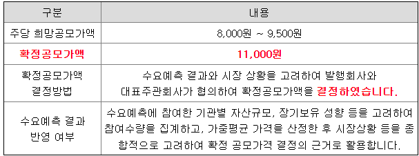 확정공모가액은 동 수요예측 결과 및 주식시장 상황 등을 고려하여