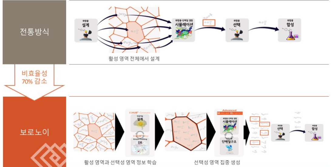 AI가 고도화 되기 위해서는 AI의 예측에 대해, 실제 물질의 합성 및 실험을 통해 도출된 실측 결과 데이터가 다시 피드백되어야 합니다. 따라서 보로노이는 Kinase에 집중된 전문 연구인력과 자체 인프라를 활용하여, 매년 AI가 제시한 4,000개 이상의 신물질을 직접 합성하고, 최대 18,000두 설치류 실험을 통해 약물의 약효, 혈중농도, 뇌투과도, 독성 등의 data를 업데이트하여 끊임 없이 AI 알고리즘을 고도화 하고 있습니다.