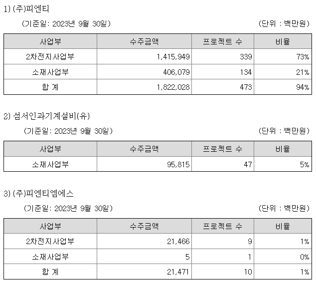 2차전지 사업부는 EV 상용화, Mobile 기기 다양화 및 출하량 증가, 2차전지 종류의 다변화에 따른 신규 수요 증가 및 사업 결합 증가로 2023년 3분기 매출액은 2,594억원 달성하였으며, 수주잔고는 보고기간 말 기준 14,374억원으로 전기대비 3,120억원 증가하였습니다.