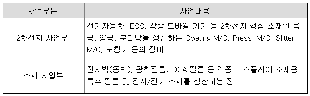 2차전지사업부는 전기자동차, ESS, 각종 모바일 기기 등 2차전지 핵심 소재인 음극, 양극, 분리막을 생산하는 Coating M/C, Press M/C, Slitter M/C, 노칭기 등을 생산하고 있습니다.