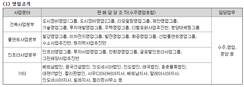 - 민간공사 : 제철 플랜트 및 건축의 2가지 기존 핵심 축에 대한 미래 경쟁력 강화 및수익성 제고와 함께 화공, 에너지 플랜트 및 신재생 에너지 등의 신사업분야 진출을 통한 수주 확대 및 사업다각화 전략을 추진하고 있습니다. 건축분야의 경우 정확한 시장분석을 통한 사업지 선정과 우량사업을 발굴하고 있으며, 초고층 랜드마크 건축물 시공 실적을 기반으로 해당분야의 경쟁 우위를 선점하고 있습니다. 사전 홍보를 통해 도시정비사업장을 적극 선점하여 업계 선두권을 유지하고 있으며, 수주 포트폴리오의 다각화 및 금융 구조화를 통해 전략적인 자체사업 다변화를 추진 중에 있습니다.