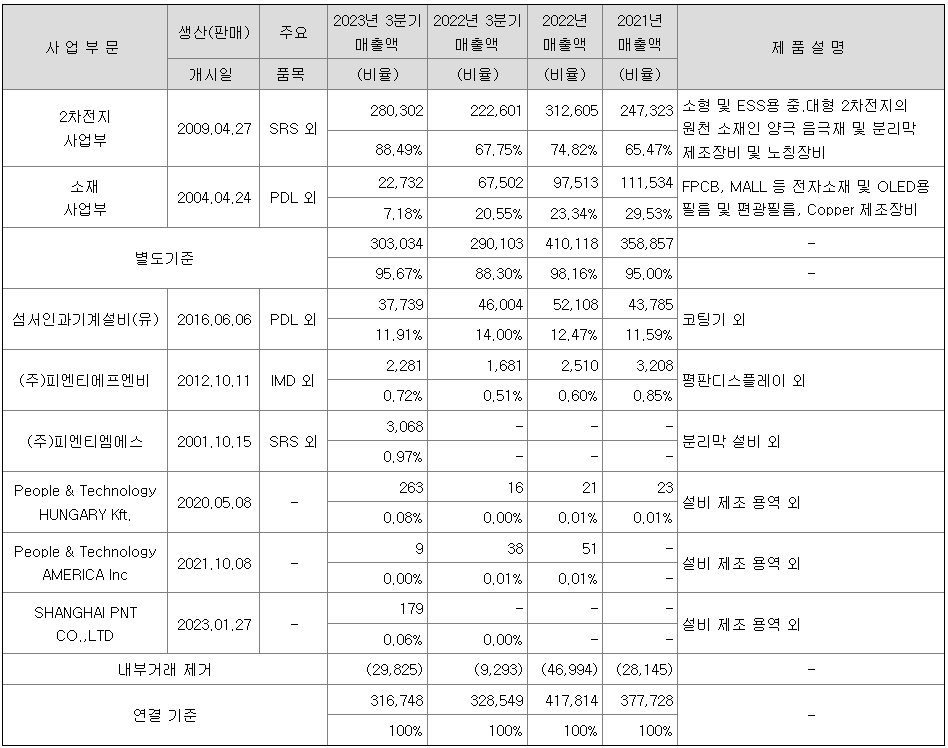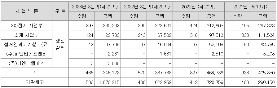 소재 사업부는 2차전지 성장에 따른 전지박 수요 급증, 전자기기 소형화 및 FPCB 범용화로 Roll-to-Roll 공정의 전자 소재 적용 범위 확대, 독자적 기술력 확보 노력 및 사업 결합 증가로 인해 2023년 3분기 매출액 573억원을 달성하였으며, 수주잔고는 보고기간 말 기준 5,019억원으로 전기 대비 1,215억원 증가하였습니다.