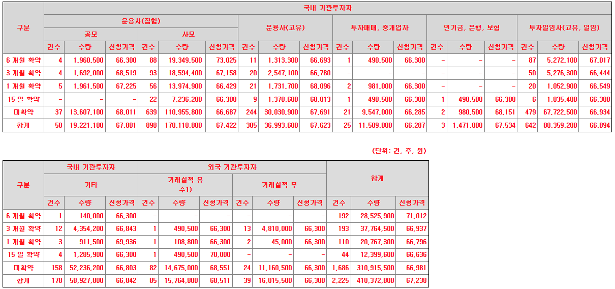 수요예측 참여 건수 및 수량은 수요예측 전 기관투자자 배정물량인 55%~75%의 상단 75%(490,500주)를 기준으로 주문을 받은 결과이며, 경쟁률은 수요예측 이후 하단 55%(359,700주)를 기준으로 산출한 결과입니다.