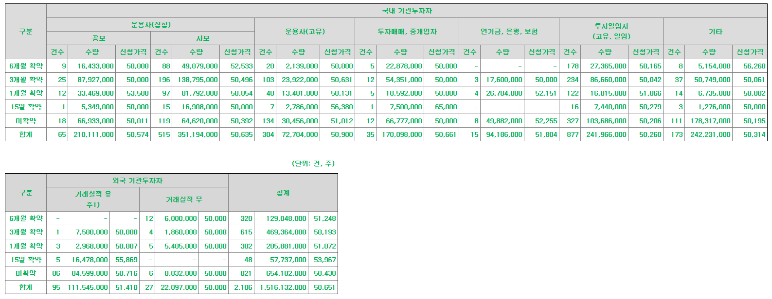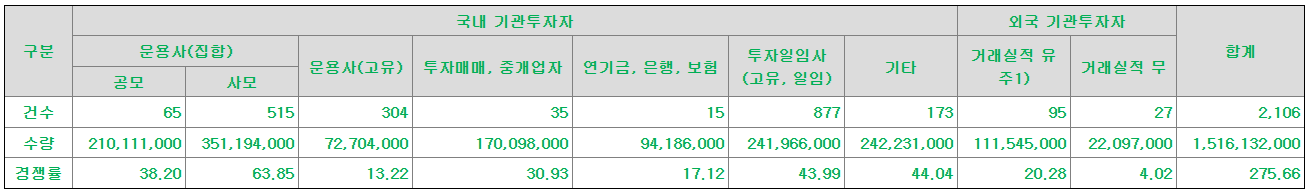 수요예측 참여 건수 및 수량은 수요예측 전 기관투자자 잠재 배정물량인 55%~75%의 상단인 75%(7,500,000주) 기준으로 주문을 받은 결과이며, 경쟁률은 수요예측 이후 하단 55%(5,500,000주) 기준으로 산출한 결과입니다.