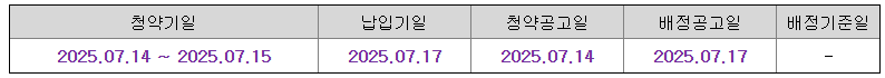 - 일반청약자 청약일: 2025년 7월 14일(월) ~ 7월 15일(화) (2일간)
