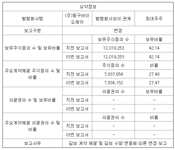 ① 조용준은 (주)동구바이오제약의 최대주주로서, 보유 주식 수에 변동이 없는 12,019,253주(보유 비율 42.14%)를 유지
