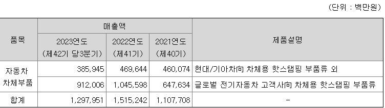 스탬핑 부품의 제조 및 판매를 주요사업으로 영위하고 있습니다. 판매활동은 완성차 업체를 대상으로 이루어집니다. 완성차 업체의 신규 차종 출시 일정에 맞추어 부품을 공급할 부품사를 대상으로 공개입찰을 실시하며 해당 입찰에서 성공할 경우 연결회사가 대상 차종에 적용되는 핫스탬핑 부품을 수주하는 형태입니다. 각 완성차 업체별 매출액은 다음과 같습니다.