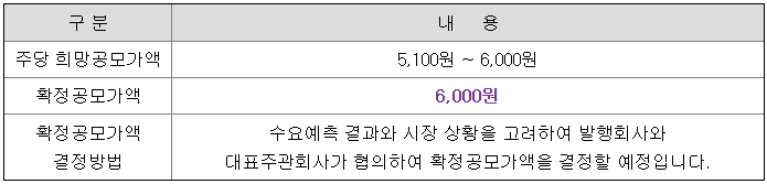 대표주관회사인 미래에셋증권㈜는 상기 희망공모가액을 바탕으로 국내외 기관투자자를 대상으로 수요예측을 실시하였으며, 확정공모가액은 동 수요예측 결과 및 주식시장 상황 등을 고려하여 대표주관회사 및 발행회사가 협의하여 6,000원으로 최종 확정하였습니다.