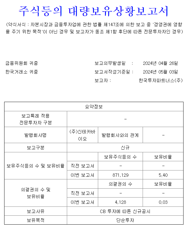 ① 한국투자파트너스(주)가 신테카바이오의 주식 871,129주를 새롭게 보유하게 되었음.