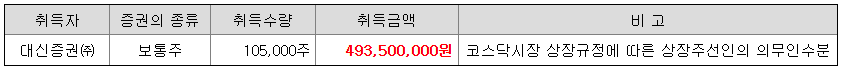 상장 시 공모 주식 3,500,000주 이외에 「코스닥시장 상장규정」에 의해 상장주선인이 별도로 105,000주를 취득하게 됩니다. 이에 따라 공모 이외의 주식 수 증가로 인해 주식가치가 희석될 수 있습니다. 한편, 금번 공모 시 청약 미달이 발생하여 이를 상장주선인이 인수하게 될 경우 상장주선인이 추가로 취득하는 주식의 수는 감소할 수 있으므로 투자자께서는 이 점 유의하시기 바랍니다.