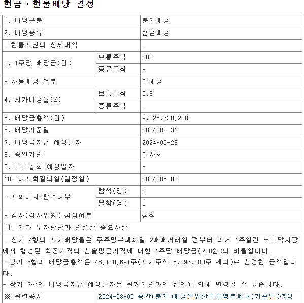 ⑥ 배당기준일 및 배당금지급 예정일자: 2024-03-31을 기준일로 하며, 2024-05-28에 배당금 지급 예정